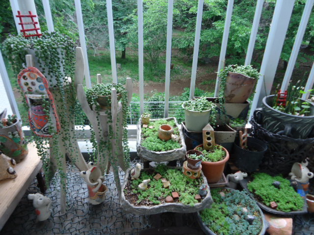 北側のバルコニ-で育ってる、グル-ンネックレスと 万年草を手作りの陶器でレイアウトしてます。