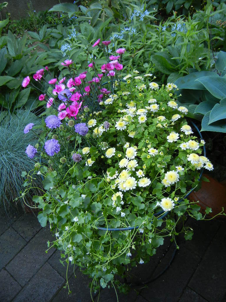 クリスマスローズの葉がワサワサ・・ちょっとさみしいので寄せ植えで変化をつけています。花期が長く次々に花を咲かせるマトカリア、スカビオサ、ナデシコなど。