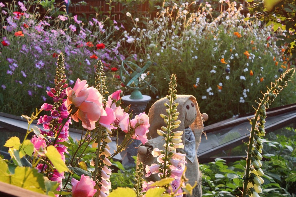 手前はブドウの葉、薔薇のティファニーとデンティーベス、ジキタリスそして向こうにはアグロステンマ、フクロナデシコ、ポピーが咲き、輝いています。