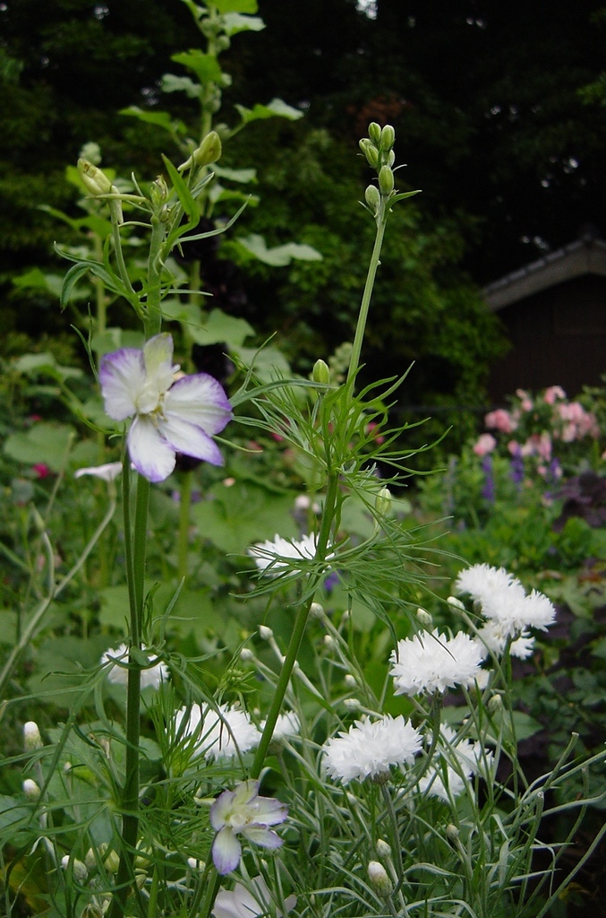 デルフィニウムと白のヤグルマソウ地味だけど好きな組み合わせ