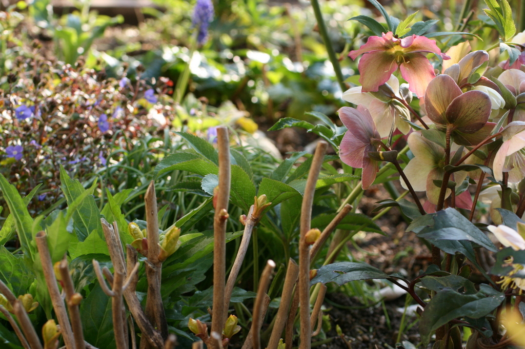 早朝の一枚 黄金葉アジサイも芽吹いています。