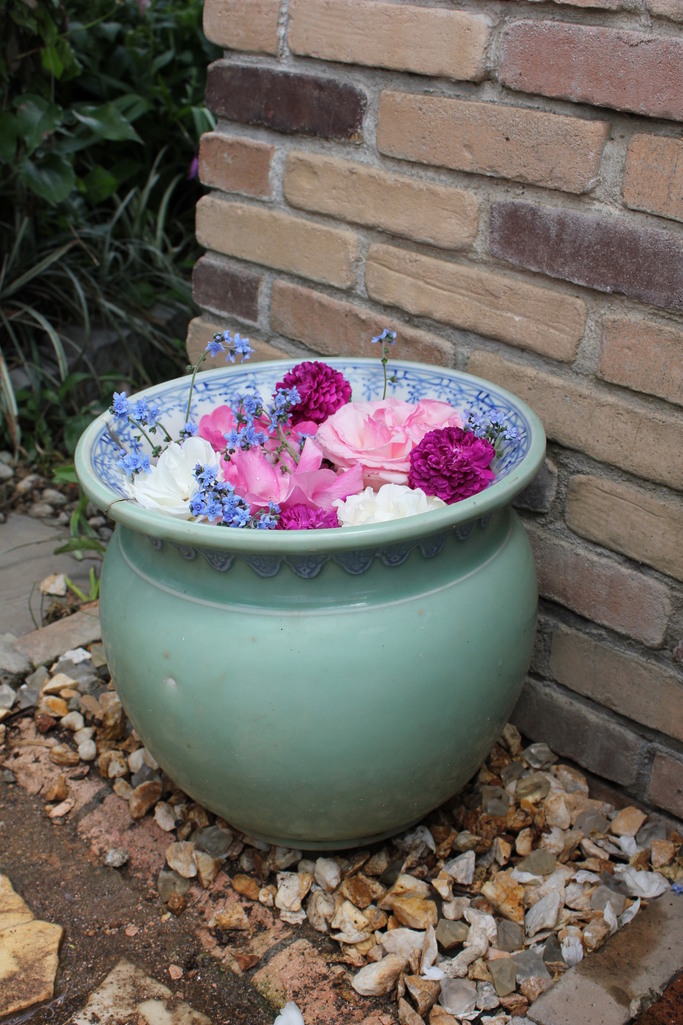 雨でいたんだ花でしたが水鉢に浮かべたら生き生きと蘇り二度楽しめました。