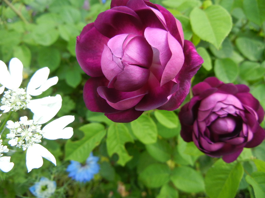 濃い紫の花色と、花の姿がとても素敵なバラ、我が家にも迎えたくなります。