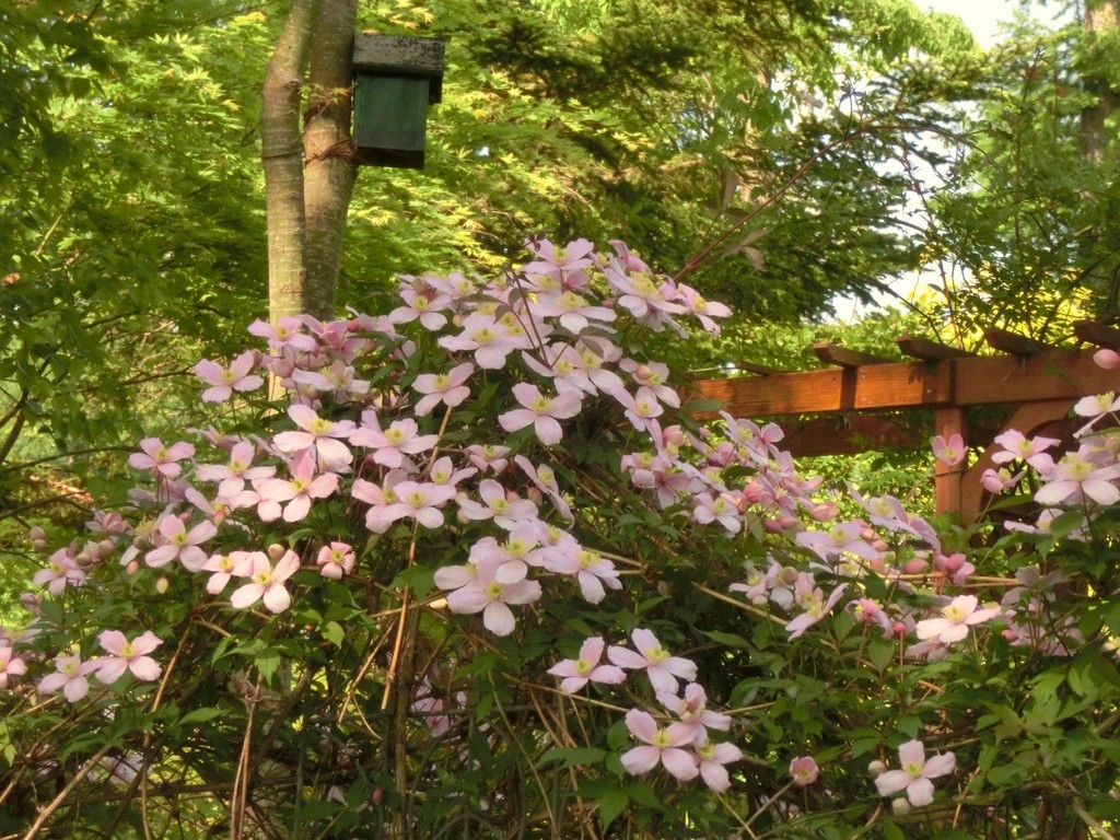 道路沿いのフェンスの上に這わせたクレマチスのモンタナちゃん、今年の2月の大雪で倒れて枝がかなりダメになっていたので心配でしたが、今年も無事咲いてくれました。