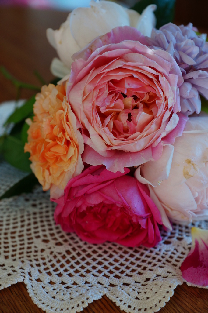 昨日摘み取った咲き終わりのバラを水につけておいたら、少し元気に。 小さなブーケにしてたのしみました。
