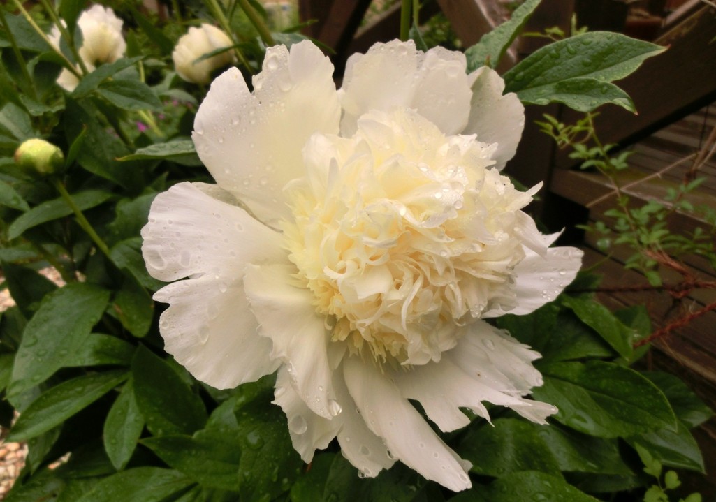連日降り続く雨の中、蕾がだいぶ膨らんでいたシャクヤクが一斉に開花し始めました。