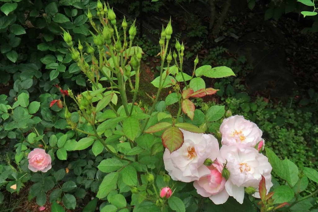 旺盛なシュートを出してきました。新芽には必ず花芽をつけてきます。こんなバラはめずらしいですね。