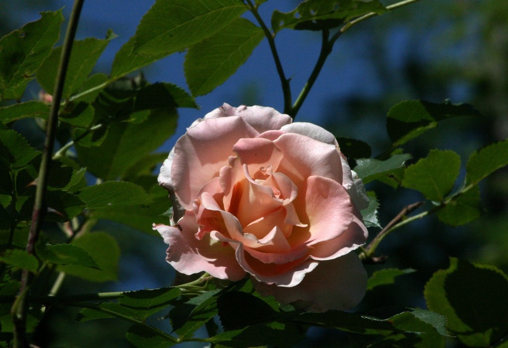 庭のスティール・パーゴラの上に這わせたロココ。沢山の蕾が次々に咲いてくれます。