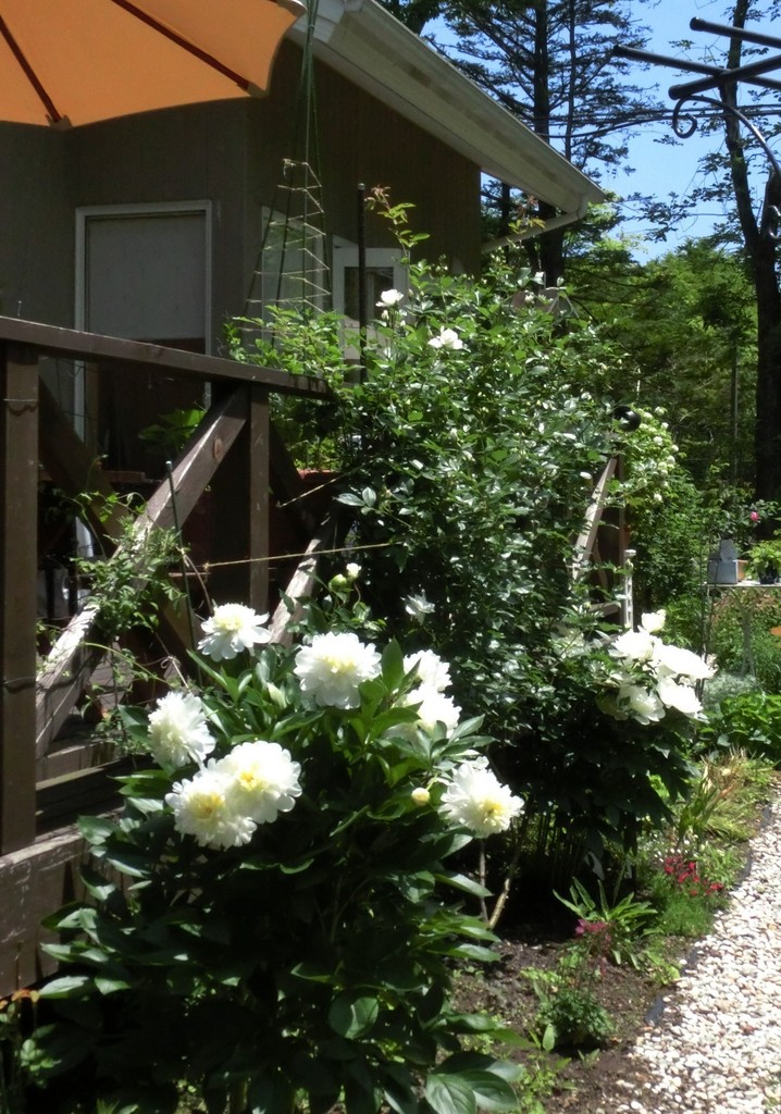 デッキの前の足元に植えてある純白のシャクヤク、その間のアイスバーグ、そして奥に見えている真っ白なクレマチス・ダッチェスオブエジンバラ、暑い日差しの中でとってもきれいです。
