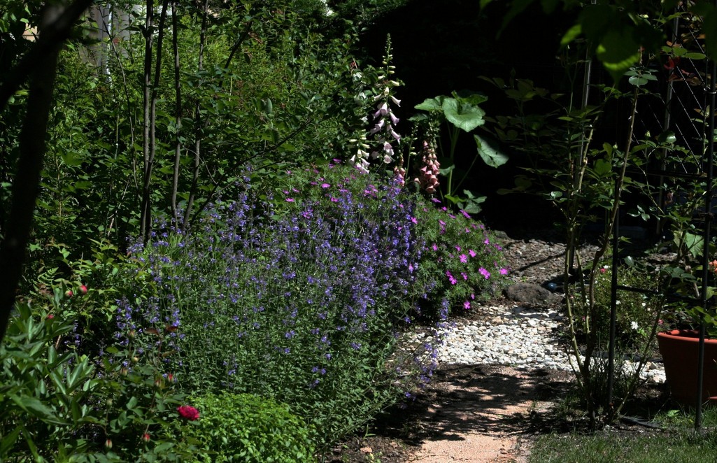 手前の赤い花はバラのハイディ・クルム、左端の赤い蕾はシャクヤク、正面の薄紫はキャットミント、その向こうのピンクの花はアサマフウロ、一番奥はジギタリスとタチアオイです。