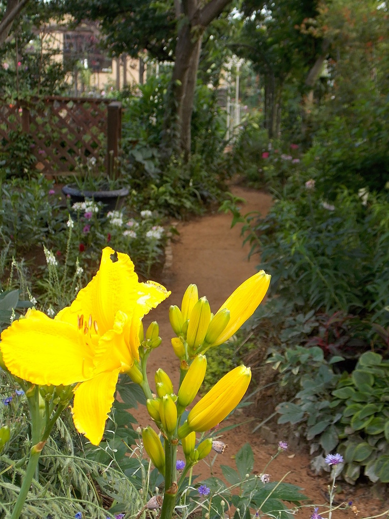 シェードガーデンに鮮やかなレモンイエローのへメロカリス開花。