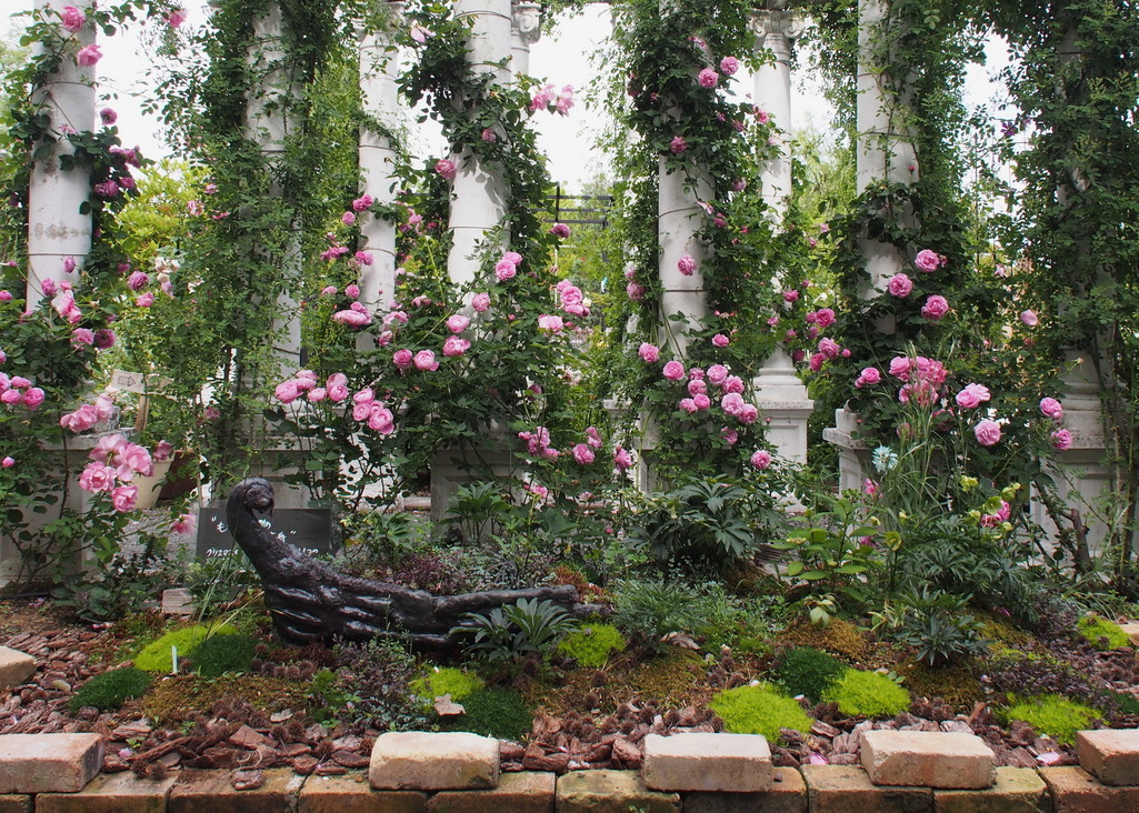 浜名湖花博2014(ブース名:ローズマルシェ東海)で植栽のトータルコーディネートをさせていただきました。 石柱に絡ませたスパニッシュビューティー、ルイーズ・オジェ、ラ・レーヌ・ビクトリア、マダム・ピエール・オジェ。 足元のへレボ植栽は冥王堂のあや店長の力作です。