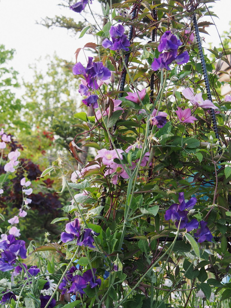 開幕序盤(4月5日~)の見所が少ないということで、設置した3基のクレマチスタワー。モンタナ→ビチセラ系のコンビネーションへと咲き次ぎ、最後はこんなふうにスイトピーとの素敵なコラボを見せてくれました。