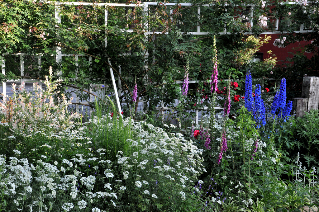 青いデルフィニウムがアクセントになっていますね。私の好きなお花がたくさん。ステキなお庭ですね。
