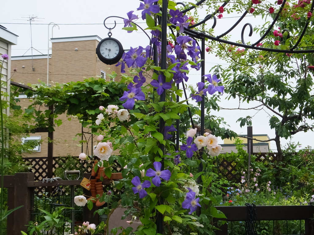 バラとクレマチスが花時間をお知らせします。