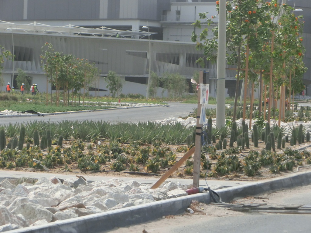 外気温45℃ ラマダン期間中のUAEを旅して来ました 雨の少ない国 気になる水やりは自動散水装置が張り巡らしてあります Abu Dhabi YAS地区 歩道脇にはサボテンと多肉植物が植え込んであります