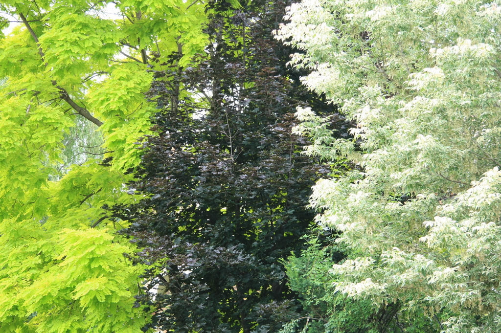 3本の木、左よりフリィーシア、クリムソンキング、ネグンドカエデ
