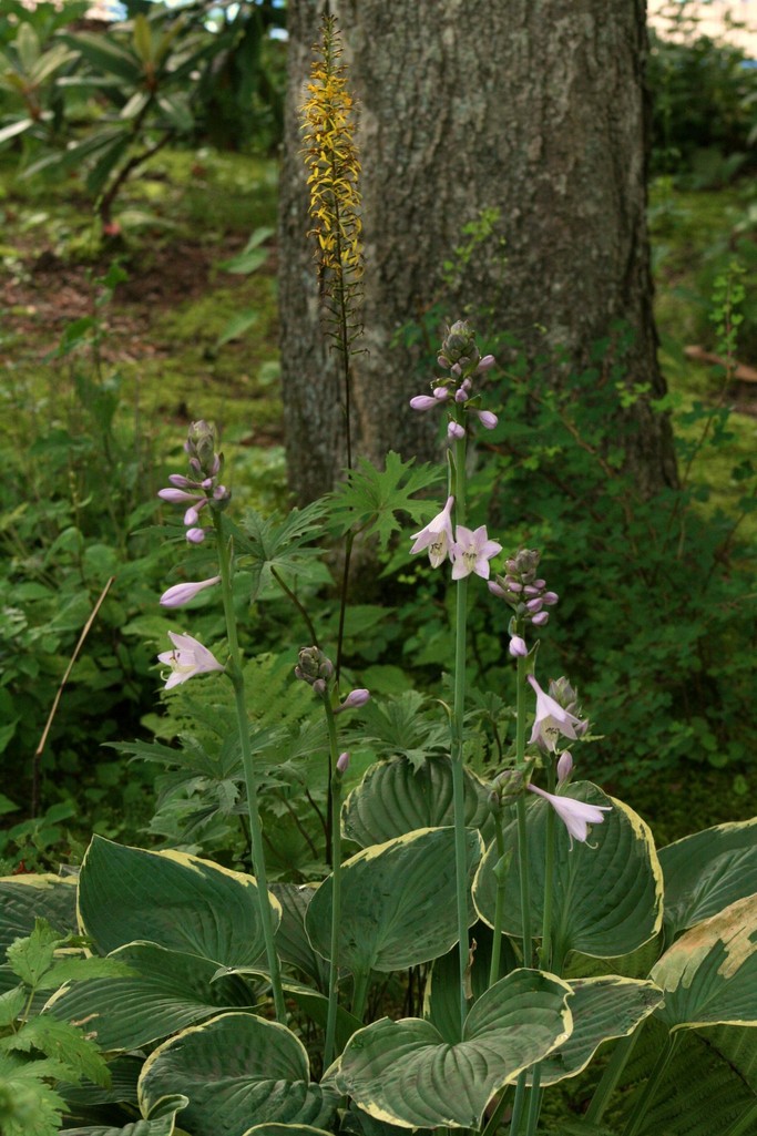 庭の日陰の苔庭ではリグラリアやホスタの花が一斉に咲いています。