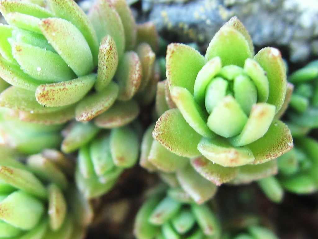 コンクリートの隙間にぎっしりと多肉植物が。アップで撮ると花のよう。ぽろぽろ葉がこぼれてはそこからまた増えてく逞しい植物ですね。