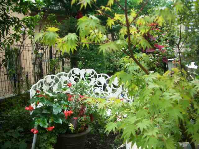 まだ、青い葉のもみじの葉の後ろに赤いベコニアがまだまだ元気であざやかです。