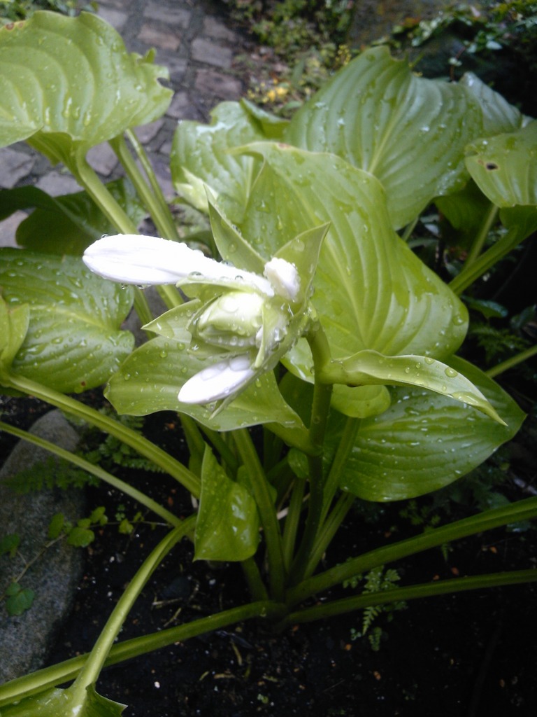 すっかり涼しくなり、秋のよう。 雨に濡れた「ホスタ・アフロディーテ」 もうすぐ純白の花が咲きそうです。