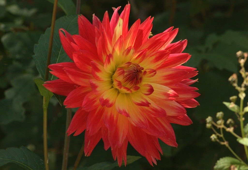 庭の大輪ダリアの花が見事に開花し、まるで真っ赤に燃える太陽のようです。