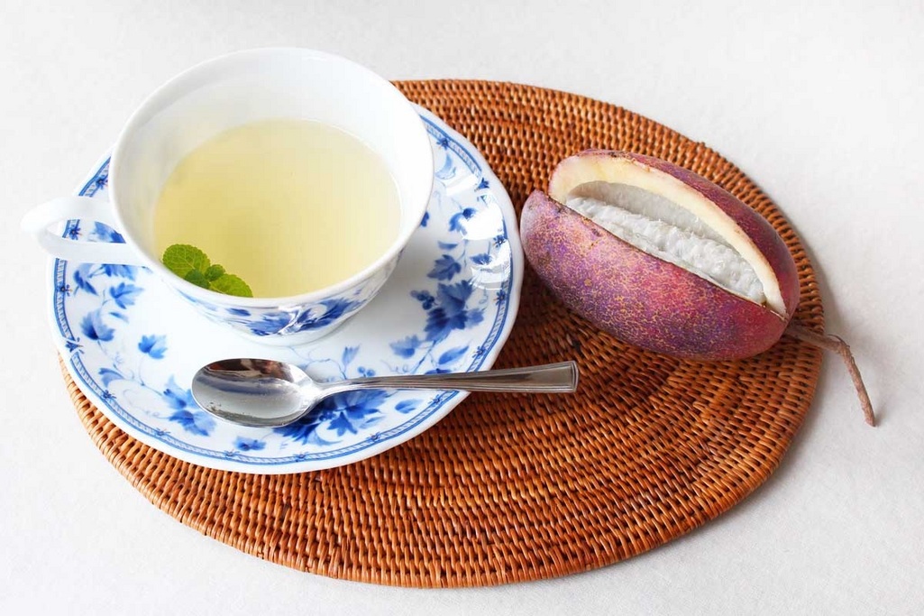 レモングラスとミントのハーブティーに、今日はアケビを味わいます・・・私は野生種のミツバアケビ