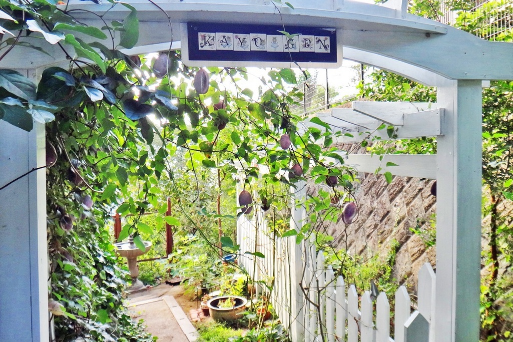 素敵なアーチとフェンスにアケビの蔓がよく似合ってます。