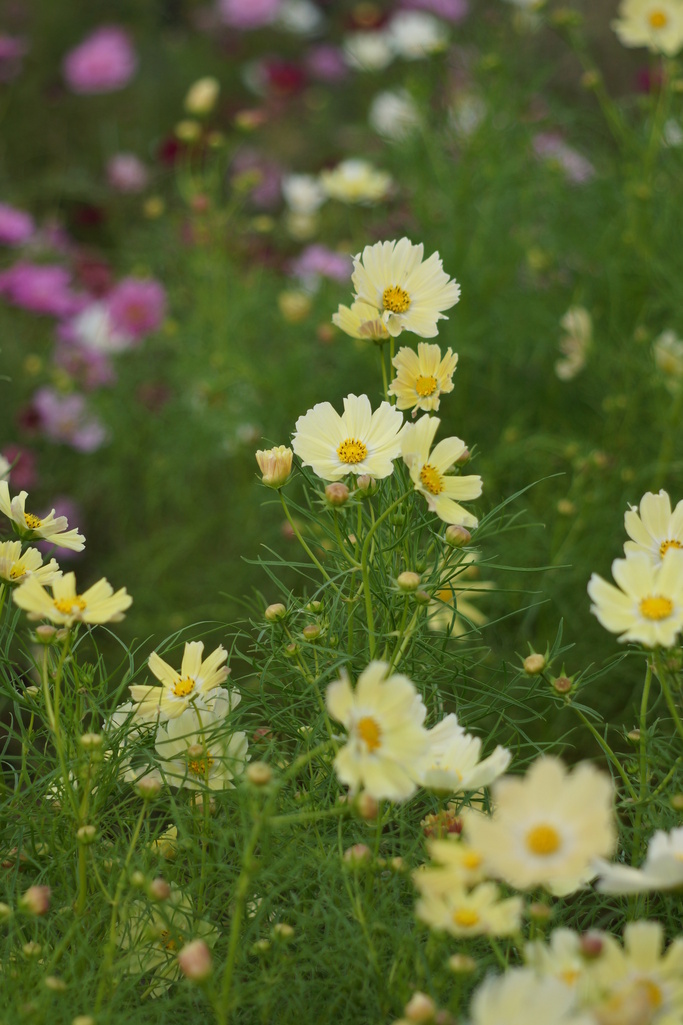 優しい黄色のコスモス。 今年は園芸店でもよく見かけます。