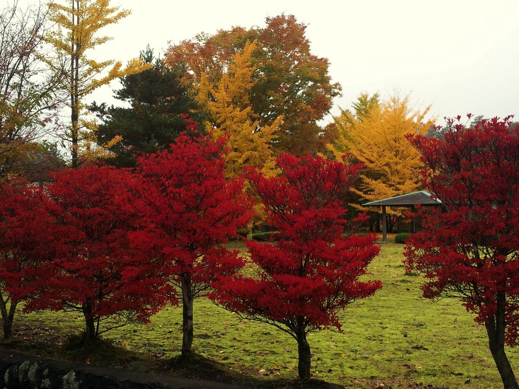 近くの公園の周りに植えられたドウダンツツジが真っ赤に紅葉し、奥に見えるイチョウやケヤキももうすっかり黄色や茶色になっていました。