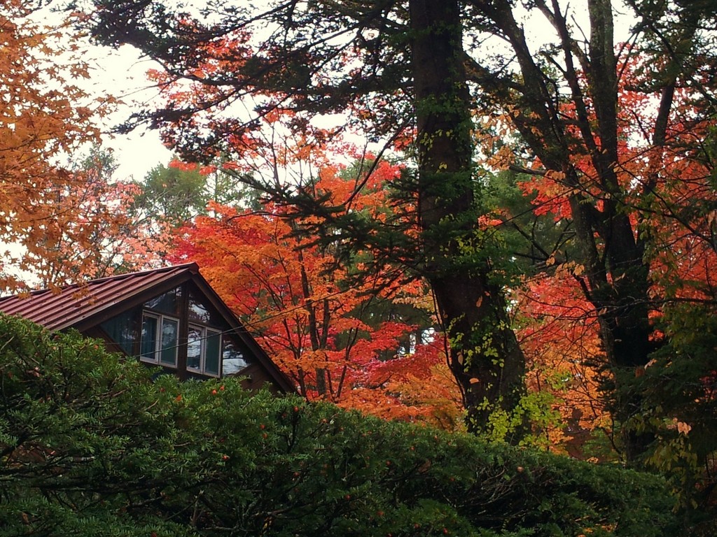今日は朝から寒く、日中の最高気温も10度を下回りました。イチイの垣根の向こうに見える別荘のお庭のモミジがとっても綺麗です。