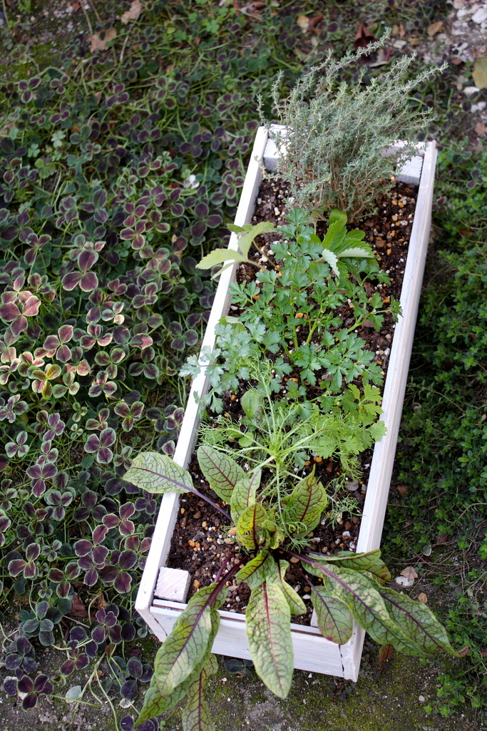 オマケの寄せ植え。板の端切れでボックスを作りサッとペイントして、庭から集めてきた苗を植えました。ミニキッチンガーデン。受け取った人がガーデニングに目覚めてくれることを期待して…このほうが力が入っているかも。