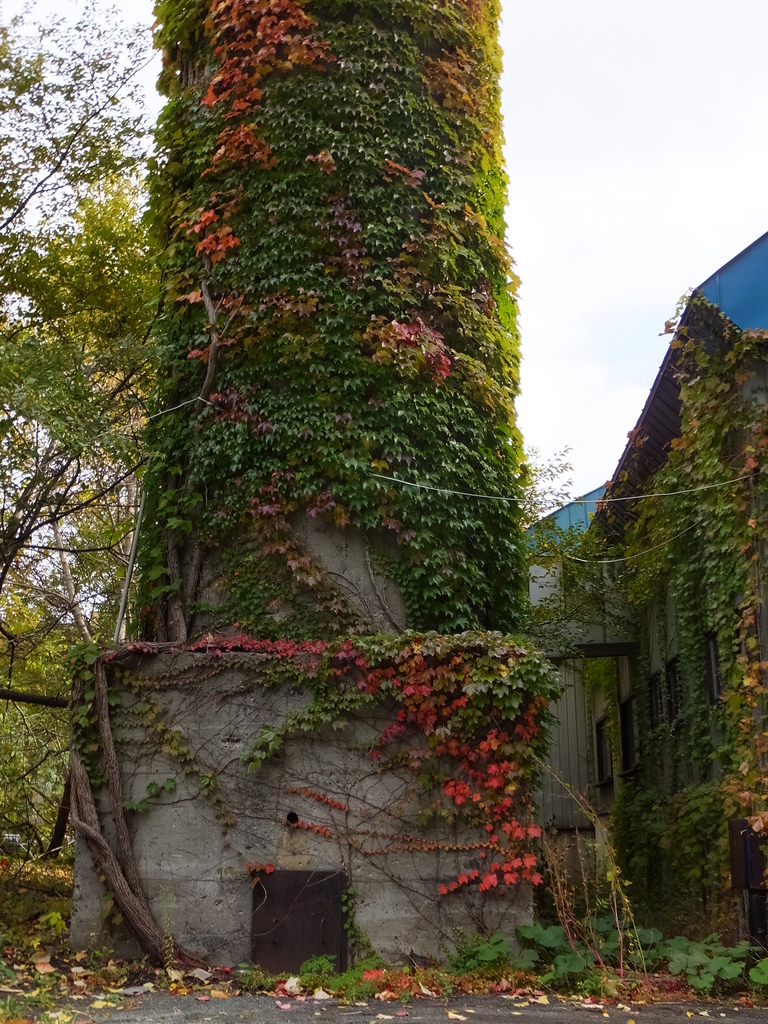 ツタの色に見とれて見上げた煙突デスガ収まらず・・・。