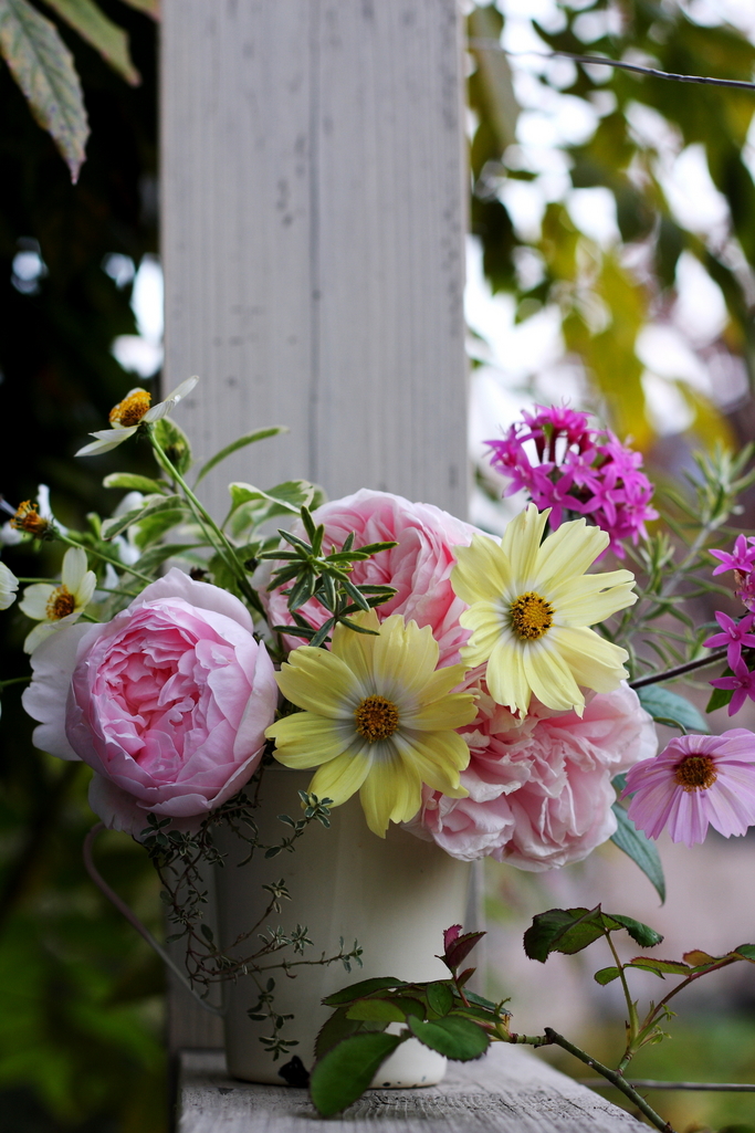 11月の日ざしのようなコスモスの黄色とキャサリン・モーリー、スーベニール・ド・ラ・マルメゾンのピンクが溶け合っています。