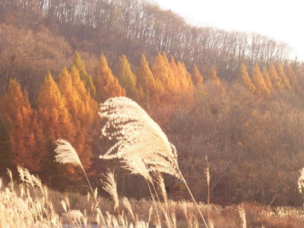 ススキの向こうにメタセコイアがたくさん並んで見事に紅葉していますね。素敵な一枚です。