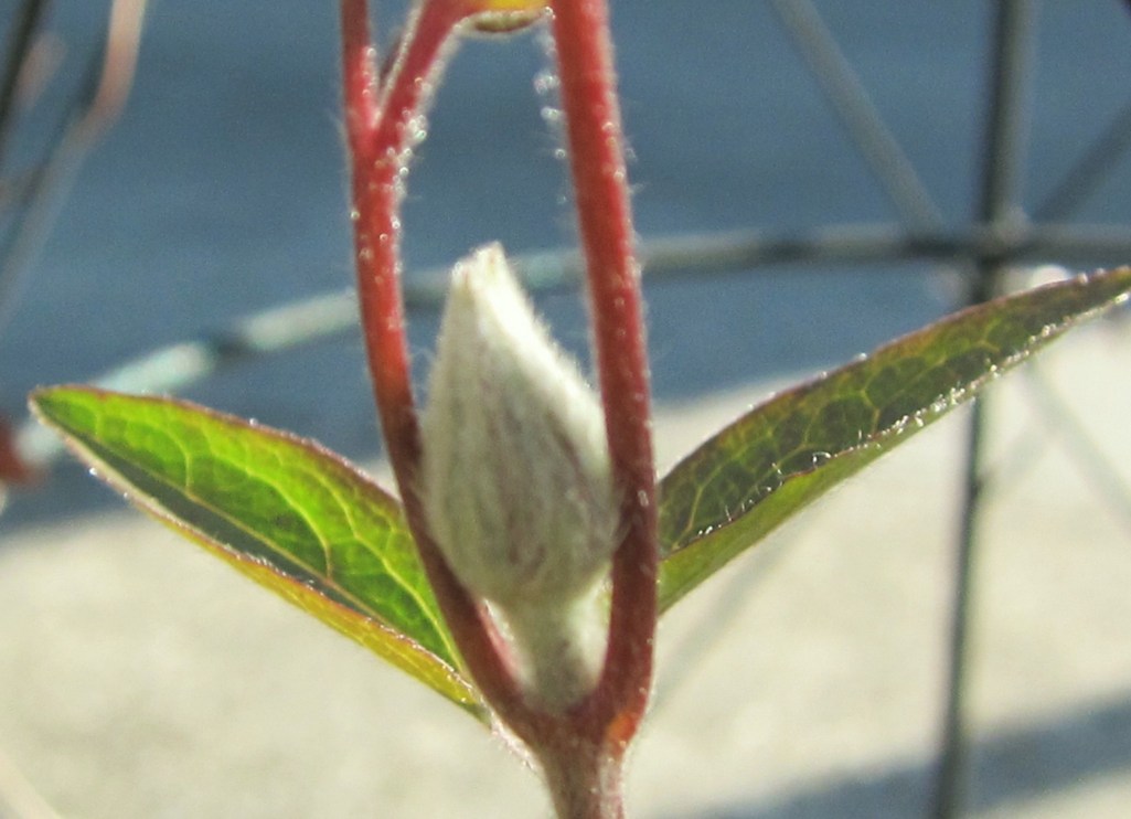 クレマチス『ザ・プレジデント』の蕾が膨らんできました。まるで背中に羽をつけた天使が伸びをしてるみたい?!