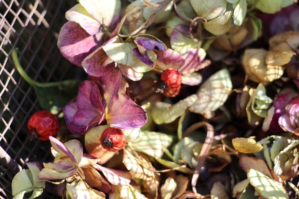バスケットに偶然入った秋アジサイ。風が吹くとカサ カサッ。音からも晩秋を感じます。