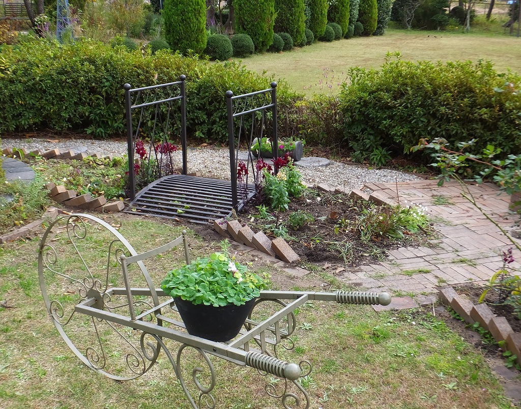 お庭に橋が置けるのですね。すご~い!花が咲く春がたのしみですね。もし、私の庭に置けるとしたら白い砂利の上に橋を渡し枯山水のように模様を描いてるかもしれません(笑)花畑に行ける橋もいいですね。