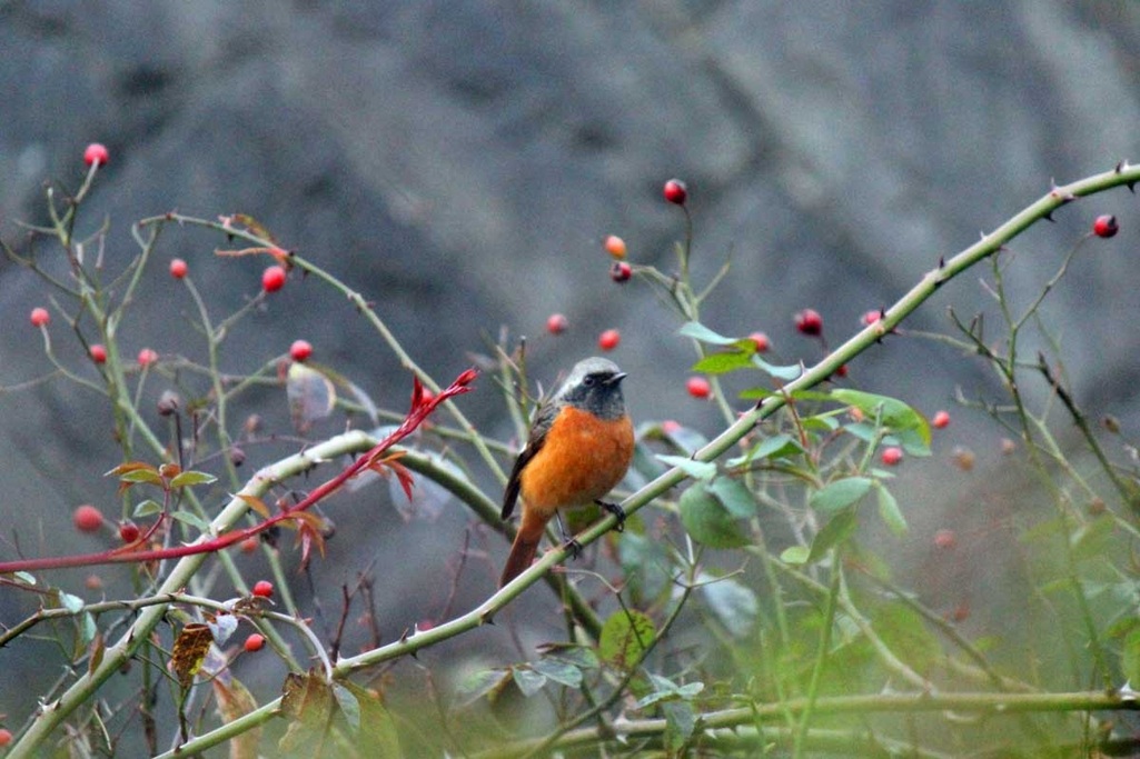 ポールズ・ヒマラヤン・ムスクのローズヒップとジョウビタキ・・