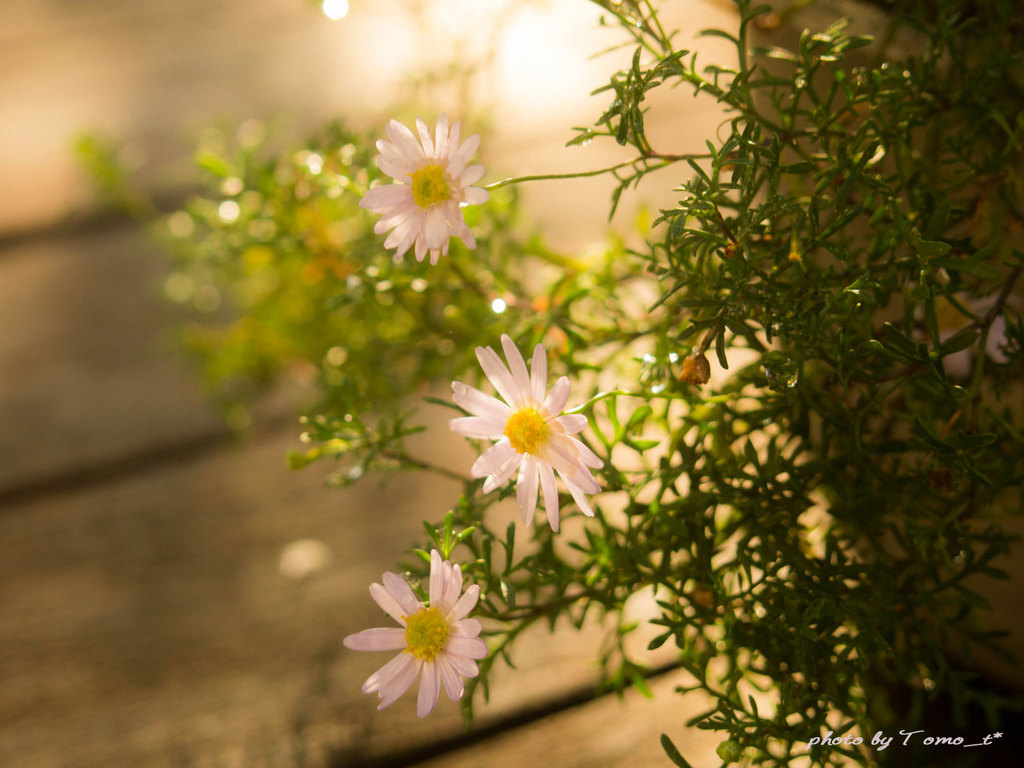 雨上がりに姫小菊、朝陽に照らされて葉っぱや花びらがキラキラしていました。(2014/11/10)