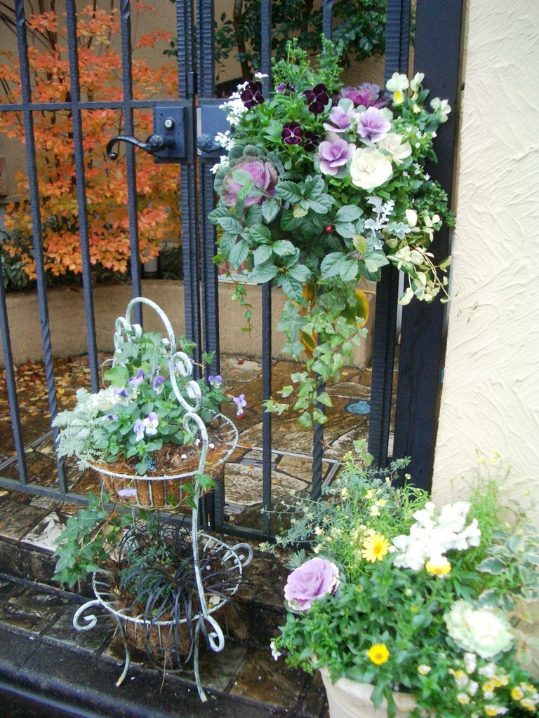ミニ葉牡丹やビオラの色がシックで”大人可愛い”寄せ植えですね。