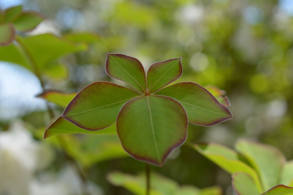 June 2014 Botanical Garden ヤシオツツジの葉。赤く縁どられ花のよう。