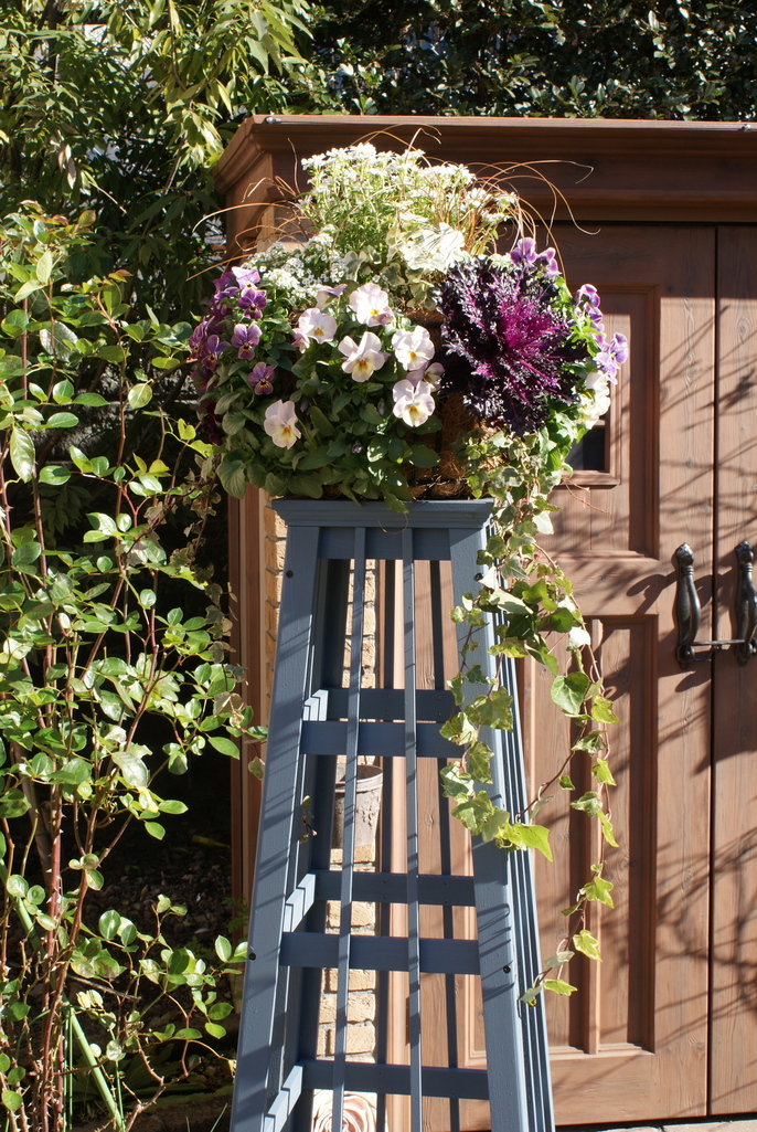 初めて吊り下げタイプのハンギングバスケットを作りました。注文して制作していただいた花台も気に入ってます。