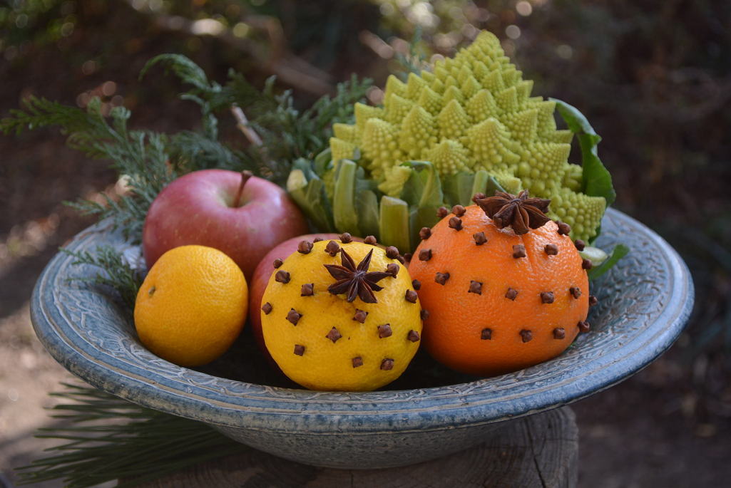 オレンジ・柚子に丁子を刺して作りました。ロマネスコ・リンゴも一緒に盛り合わせて。