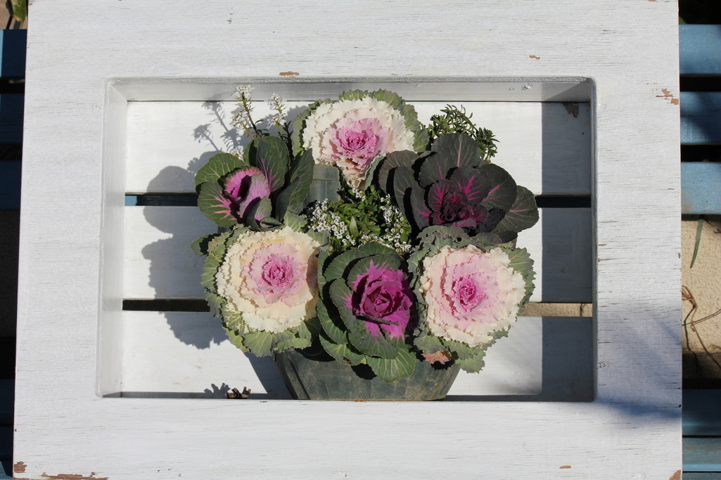 新年にふさわしい葉牡丹の寄せ植え を額に入れました