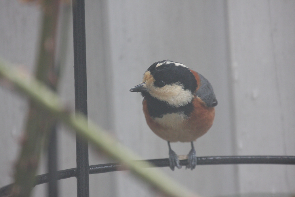 最近来てなかったヤマガラが毎日来るようになりました。雨の中、バラのオベリスクを使ってヒマワリの種を割って食べています。