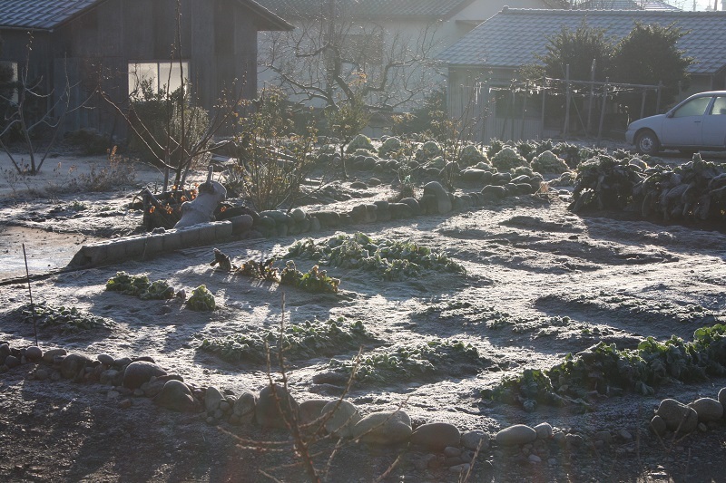 関東ローム層上にある我が地方は、 今朝いっぱいの霜が降りました。 今は朝日を受けて融けはじめていま す。