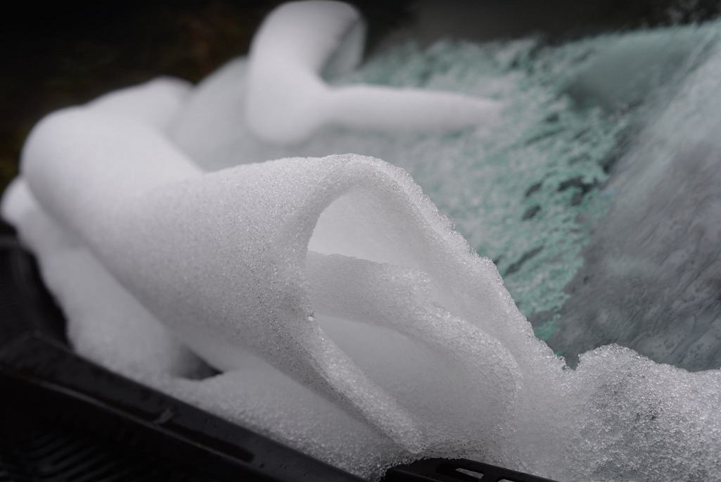 車のフロントガラスに海苔巻のような渦巻状の雪が!