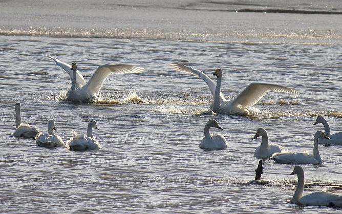 水しぶきを上げ着水と同時に羽ばたく白鳥の美しい姿