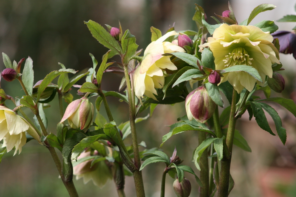 黄色のダブル、豪華で綺麗!!たくさんのクリスマスローズが咲くお庭、ステキですね。